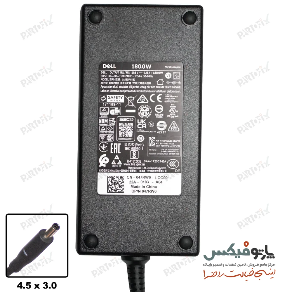مشخصات شارژر اورجینال لپ تاپ دل 19.5 ولت 9.23 آمپر کانکتور 3.0 * 4.5 اسلیم